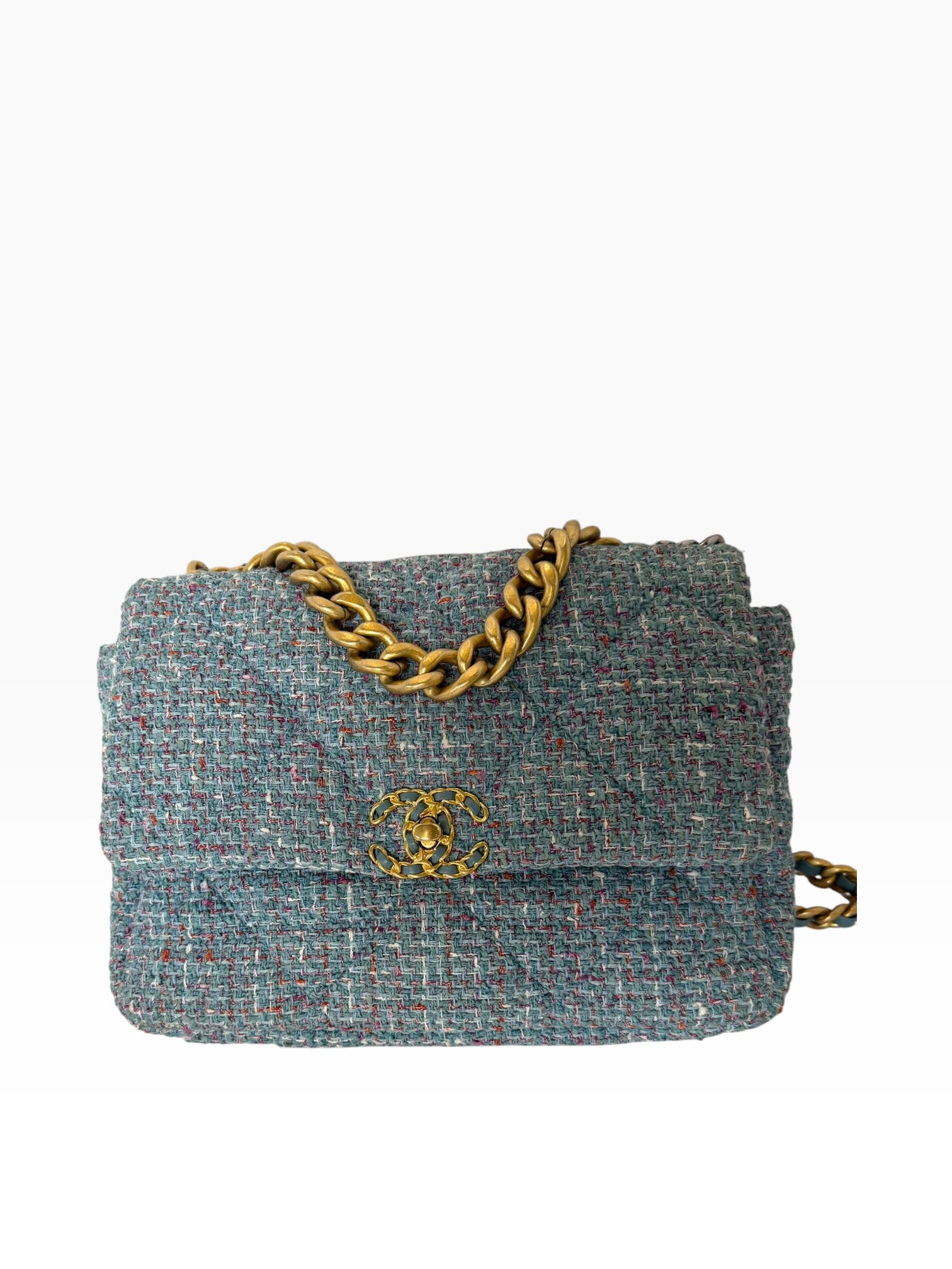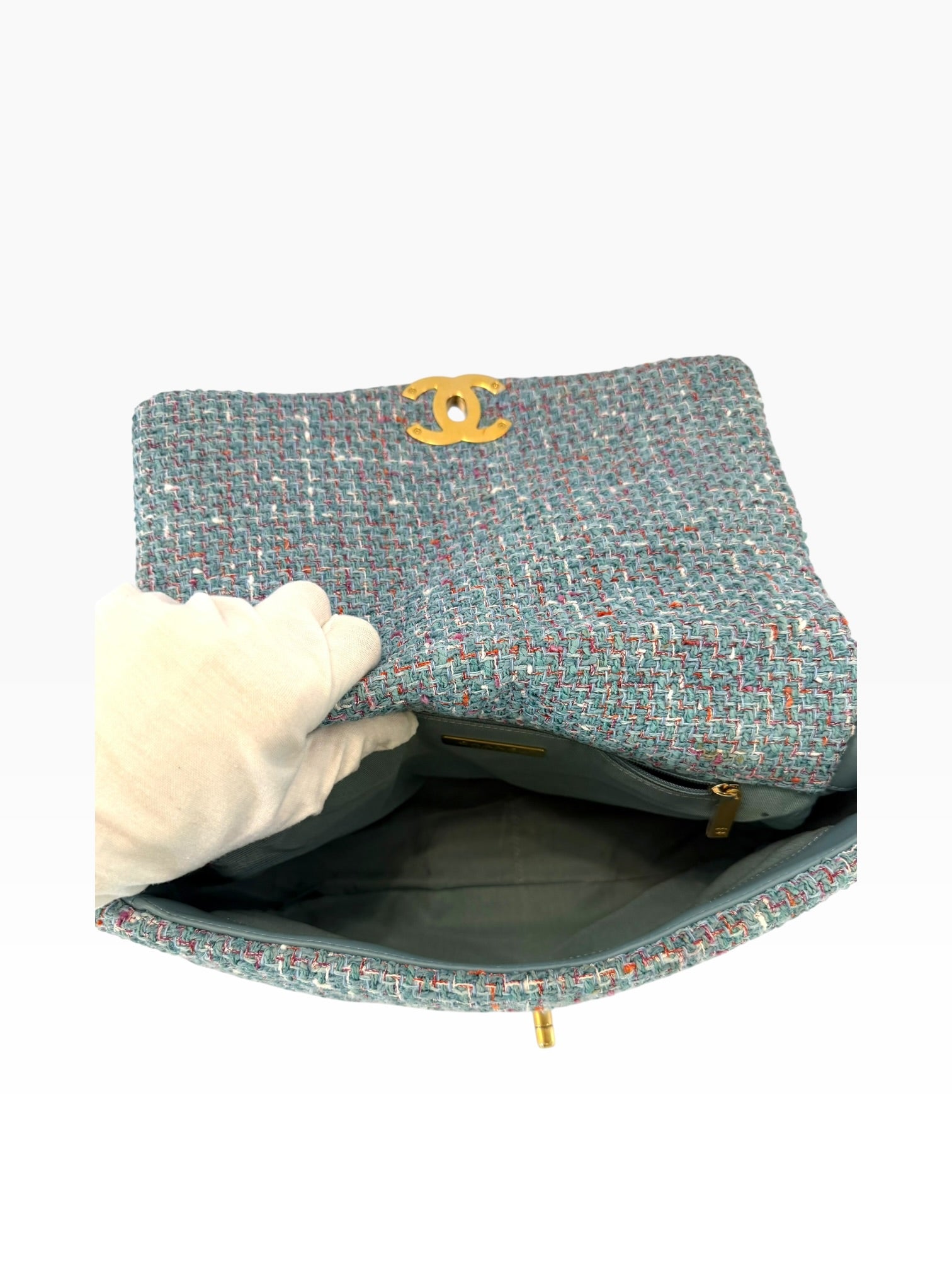 The Chanel 19 XL in striking blue tweed combines timeless elegance with modern sophistication. This oversized silhouette features the iconic interlocking CC hardware and quilted craftsmanship that defines the collection. The rich blue tweed texture adds depth and visual interest, making it a versatile statement piece for any occasion. Perfect for those who appreciate luxury accessories with enduring style and exceptional quality.
